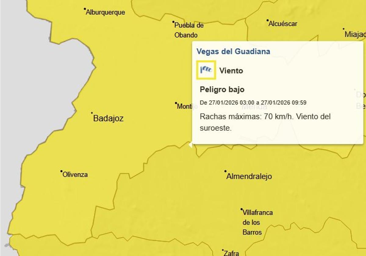De igual forma, se activa la alerta de nivel amarillo por fuertes vientos tanto en la provincia de Cáceres como en las zonas de La Siberia Extremeña, Vegas del Guadiana (donde se encuentra Olivenza) y Barros y Serena, en la provincia de Badajoz, desde la medianoche de hoy y hasta las 11.00 horas de mañana, día 27 de enero, dado que se prevén rachas de viento que pueden superar los 70 kilómetros a la hora.