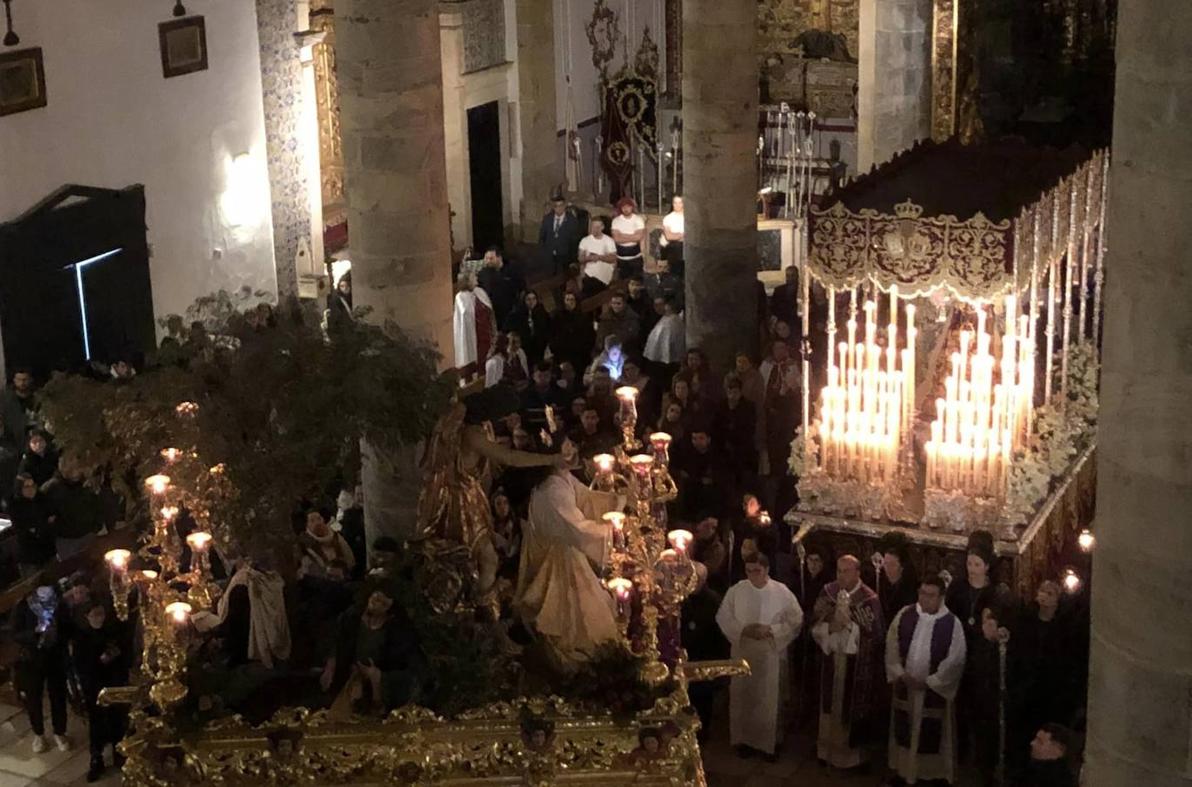 Ya dentro de Santa María del Castillo, los tres pasos realizaron un breve desfile por el interior del Templo, con el acompañamiento musical de la banda oliveña y de La Filarmónica de Olivenza.