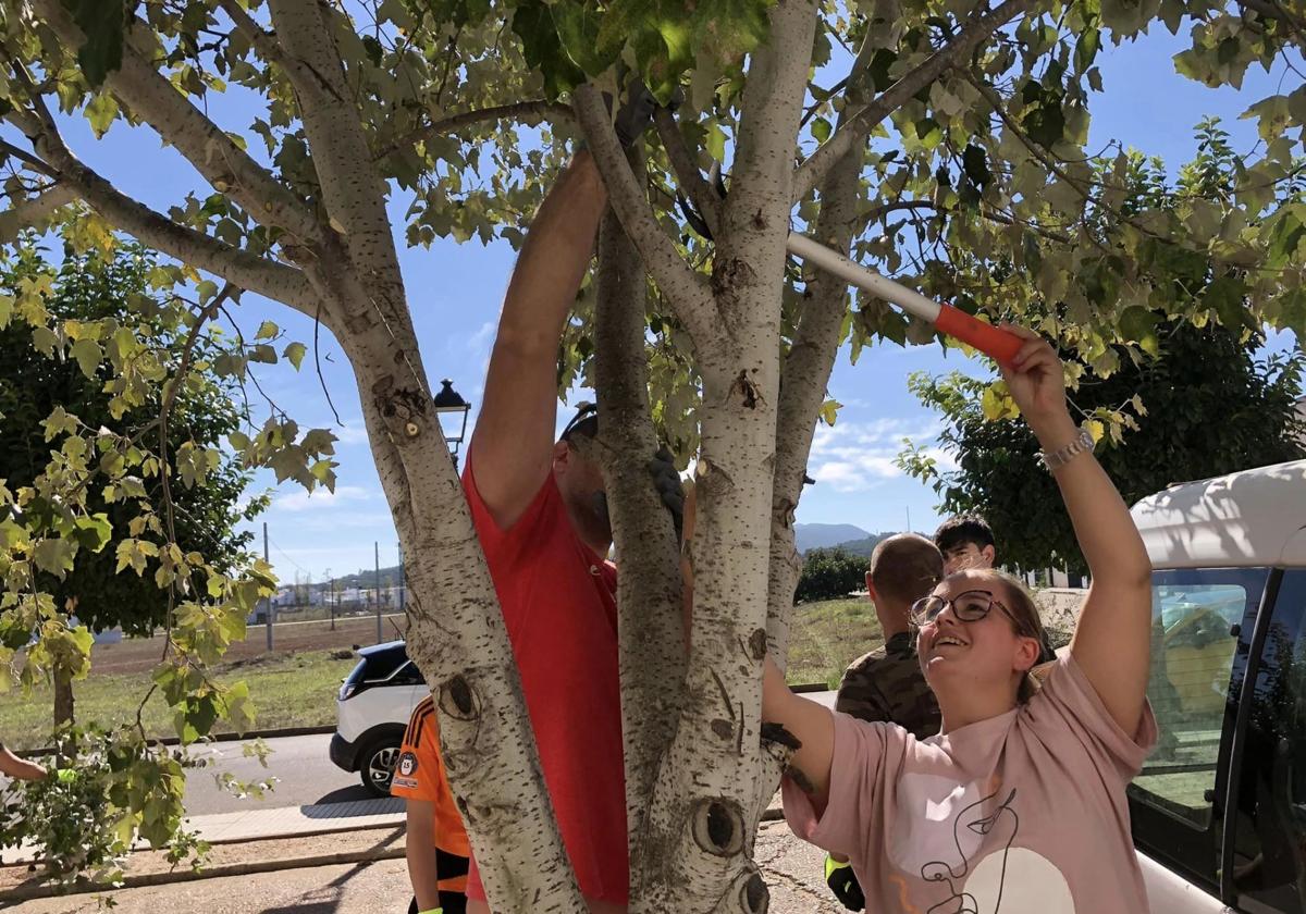 Los alumnos del curso de poda de árboles ornamentales han iniciado hoy su formación práctica en la barriada de los Naranjos, donde están llevando a cabo la poda de los árboles de la zona.