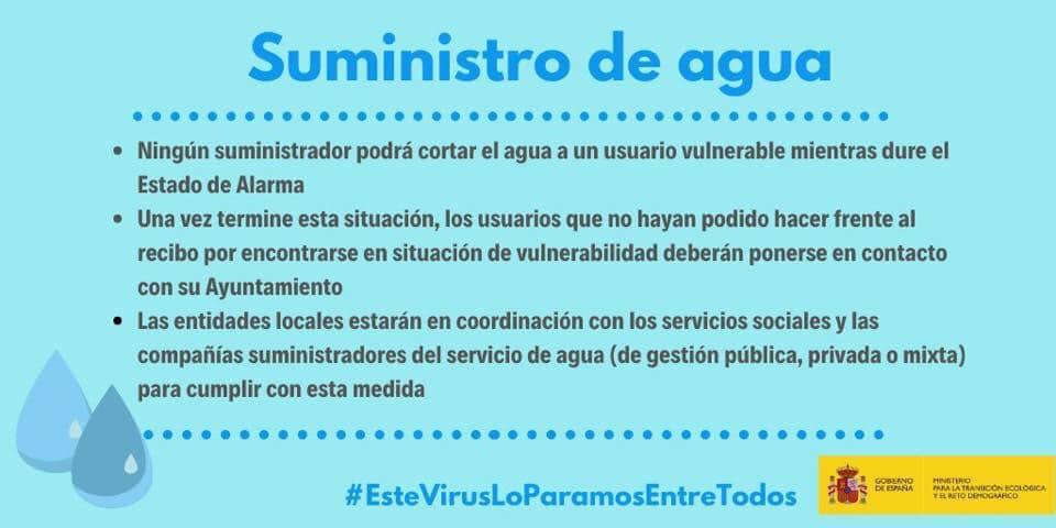 Aqualia ha informado que en una situación de normalidad, las empresas del sector de la gestión del agua contemplan la suspensión de suministro como una herramienta de actuación frente a impagos que no estén motivados por la falta de recursos económicos por parte del usuario. «Pero mientras dure esta excepcional situación, Aqualia paraliza cualquier corte del suministro de agua», han indicado.