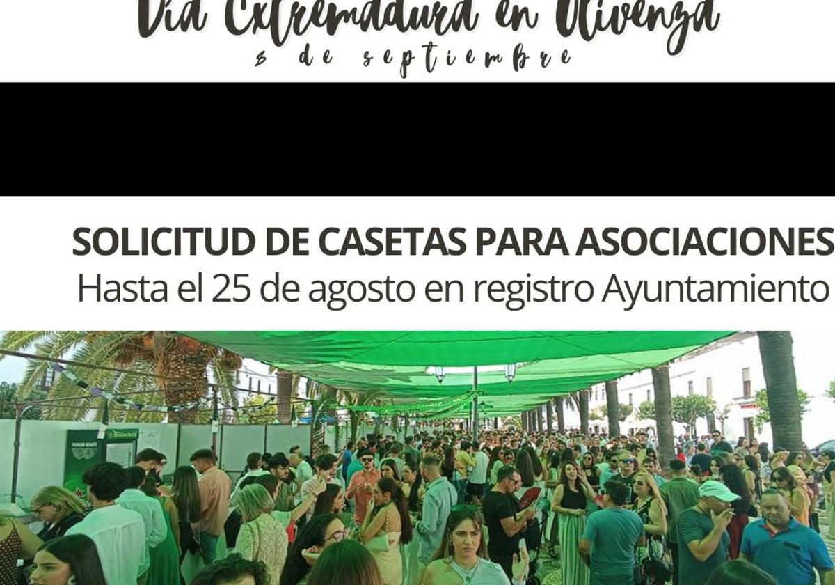 Las asociaciones interesadas en solicitar una de las casetas municipales, que cada año se instalan en la Plaza de España, con motivo de la celebración del Día de Extremadura pueden hacerlo hasta las 14.00 horas del viernes 25 de agosto presentando una instancia en el Registro General del Ayuntamiento de Olivenza.