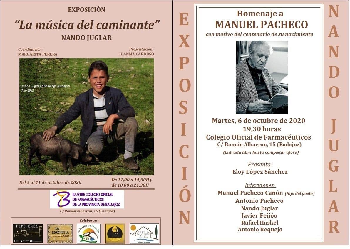 Precisamente este miércoles, 6 de octubre, Nando Juglar ha querido rendir tributo a la figura de Manuel Pacheco con motivo del centenario de su nacimiento, presentado por Eloy López Sánchez, y en el que intervendrán el hijo del poeta oliventino, Manuel Pacheco Cañón, y de otros rapsodas como Antonio Pacheco, Nando Juglar, Javier Feijóo, Rafael Haskel y Antonio Requejo. El acto tendrá lugar a las 19.30 horas en la sede del Colegio de Farmacéuticos, sita en C/Ramón Albarrán, número 15, de Badajoz, con entrada libre hasta completar el aforo limitado por causas de la pandemia.