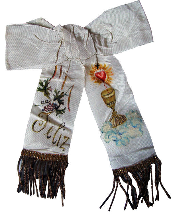 El Museo expone uno de esos complementos. Se trata de un brazalete de color blanco, realizado con una cinta, que se fija a uno de los brazos formando un lazo con dos caídas, rematadas por flecos de metal dorado. En ellas se dibuja a color un racimo de uvas con la frase «Día Feliz», y un cáliz sobre el que gotea un corazón rojo. Este complemento se utilizaba a principios del siglo XX, en un primer momento, para distinguir que el niño estaba vestido para recibir la Primera Comunión, aunque no llevara traje para la ocasión. Posteriormente, por tradición, se luce junto al resto de complementos, hasta su desaparición en los años 50/60.