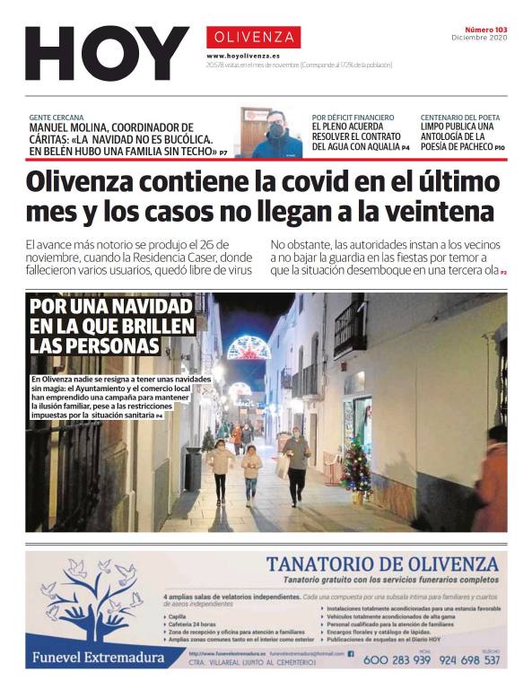 Desde este jueves, 24 de diciembre, ya está en la calle y en los puntos de recogida habituales, la edición número 103 del hiperlocal HOY Olivenza, en la que se da cuenta de la evolución epidemiológica de la pandemia por Covid-19 en Olivenza y sus pedanías en las últimas semanas, en la que si bien se consiguió, entre otras cosas, reducir hasta apenas una veintena de casos (a día 22 de diciembre) y lograr que la Residencia Caser quedara libre del virus el 26 de noviembre, las autoridades mantienen la voz de alarma e instan a la vecindad a no bajar la guardia en las fiestas navideñas, por temor a que la situación desemboque en una tercera ola.