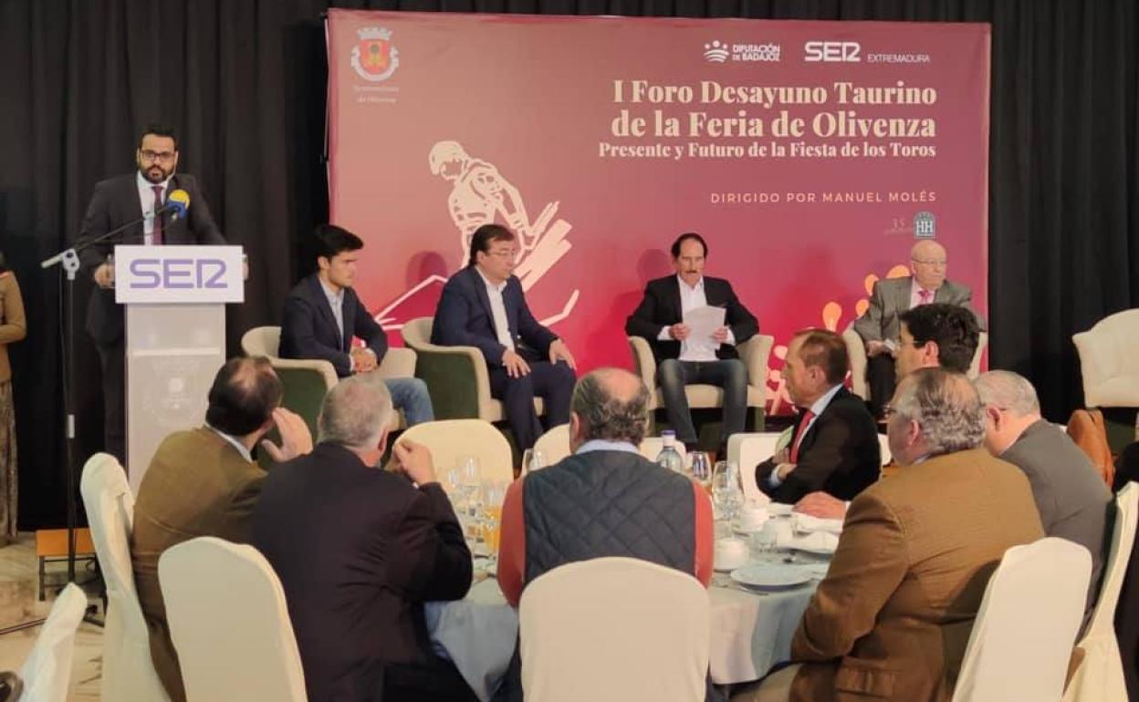 La XXX Feria del Toro ha acogido esta mañana la celebración del 'I Foro Desayuno de la Feria del Toro de Olivenza' en el Hotel Heredero, organizado por la Cadena SER y dirigido por el veterano periodista Manuel Molés, que ha reunido a más de un centenar de personas, entre profesionales del mundo de la tauromaquia, empresarios, responsables públicos, representantes políticos y aficionados.