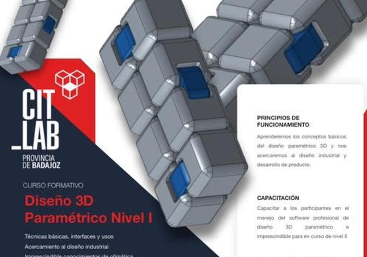 El Citlab de Olivenza ofrece un curso de Diseño 3D paramétrico nivel I durante los días 29 y 30 de abril en horario de 16.30h a 19.30h.