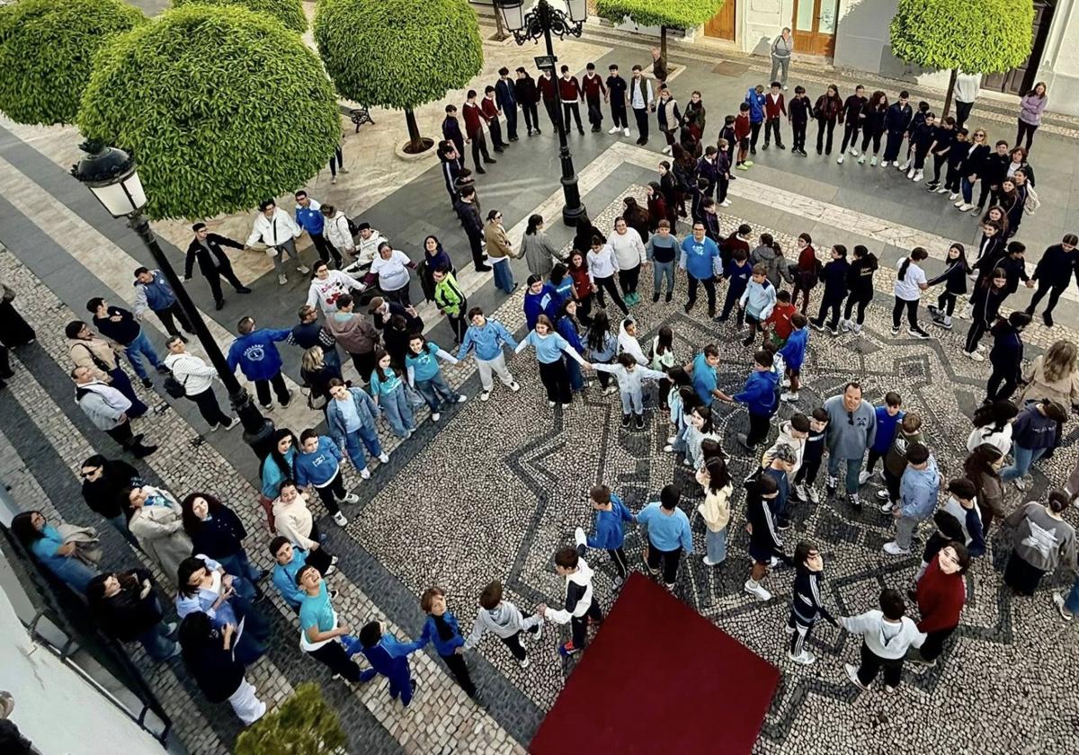 La Plaza de la Constitución acogió el acto central de esta iniciativa, en el que ha participado alumnado del CEIP Francisco Ortiz, de las Escuelas Parroquiales del Sagrado Corazón y del IES Puente Ajuda, además de Plena Inclusión, en una muestra conjunta de compromiso con la inclusión y el respeto a la diversidad.