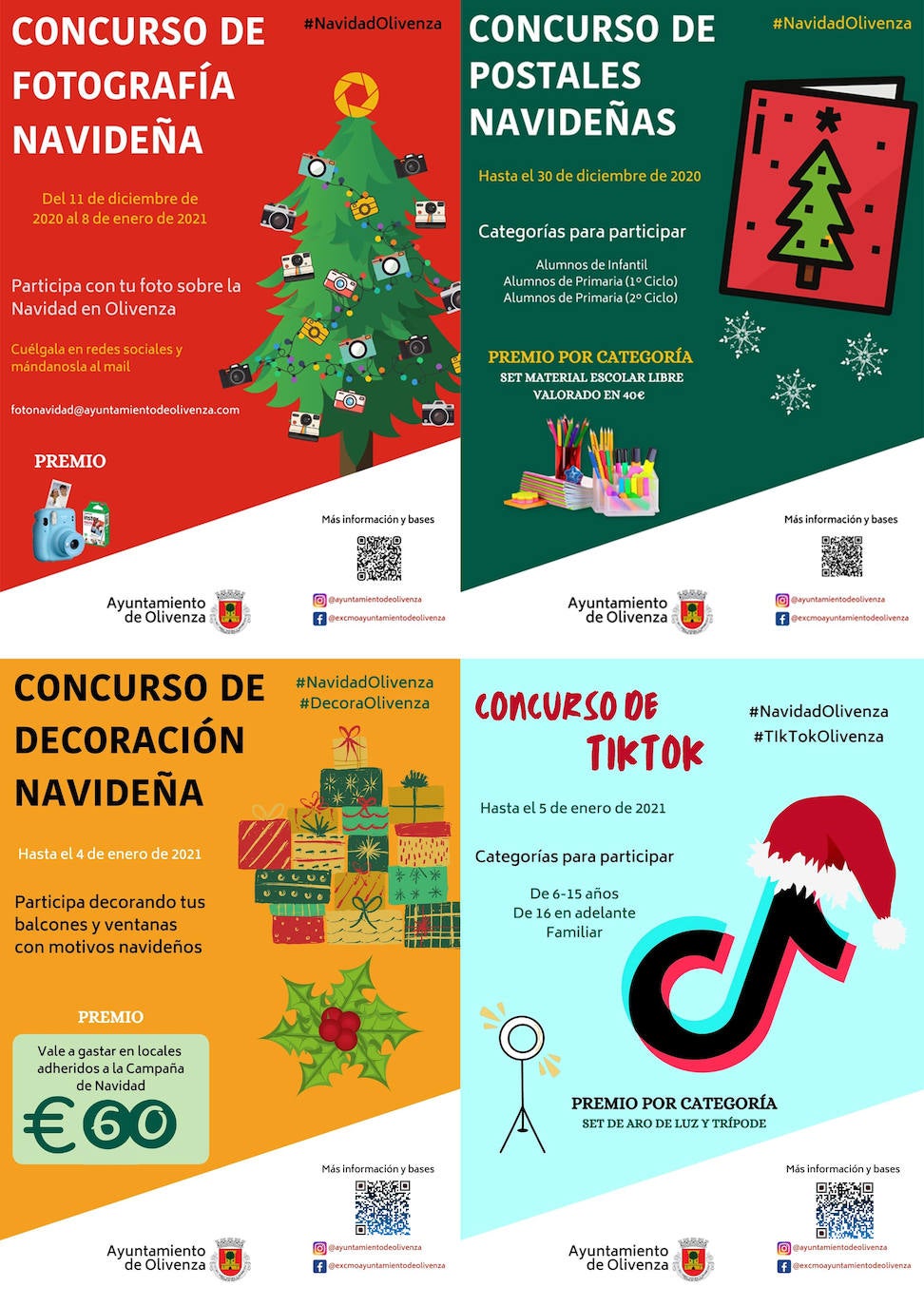 En el primero de ellos, el fotográfico de Navidad en Olivenza, podrán participar todas las personas residentes en Olivenza y sus pedanías, a partir de 14 años. Cada participante podrá presentar una obra, que ha de ser original e inédita bajo el título que consideren. Las obras se mostrarán a través de los perfiles de redes sociales oficiales del ayuntamiento con el hashtag #NavidadOlivenza y mencionando al ayuntamiento en las redes indicadas. Habrá un único premio consistente en una cámara de fotos.