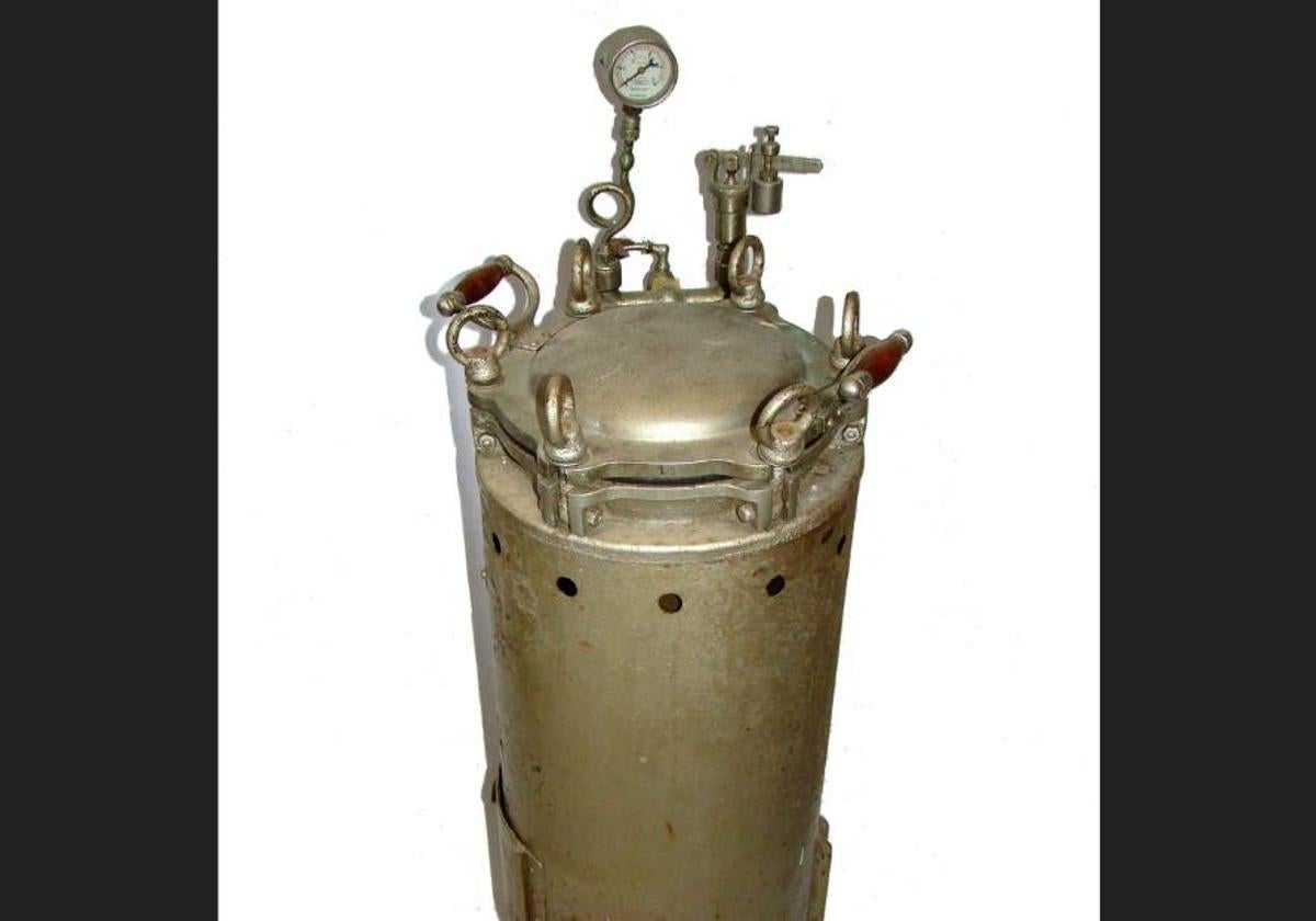 Este aparato servía para esterilizar bajo alta presión (como una olla) los materiales e instrumentos quirúrgicos de los que eliminaba los microorganismos patógenos
