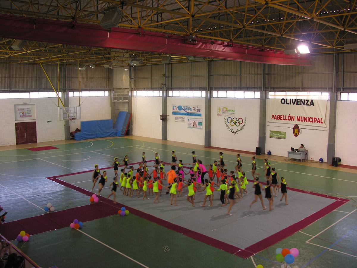 Con un desfile de todos los grupos, ejercicios de precalentamiento y otros acrobáticos comenzaba este domingo la exhibición de fin de curso de la Escuela Municipal de Gimnasia Rítmica de Olivenza, que ha reunido a sus 82 alumnas, excepto alguna baja por enfermedad, y sus familias en el Pabellón Deportivo Municipal.