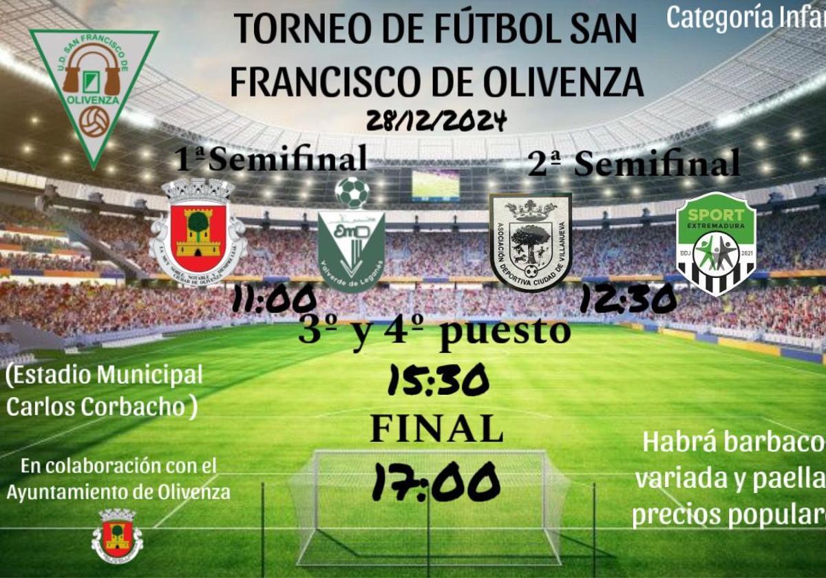 Este sábado 28 de diciembre San Francisco de Olivenza acoge un Torneo de Fútbol Infantil Navideño. El mismo se disputará entre los equipos de Olivenza, Valverde de Leganés, Villanueva del Fresno y Badajoz.