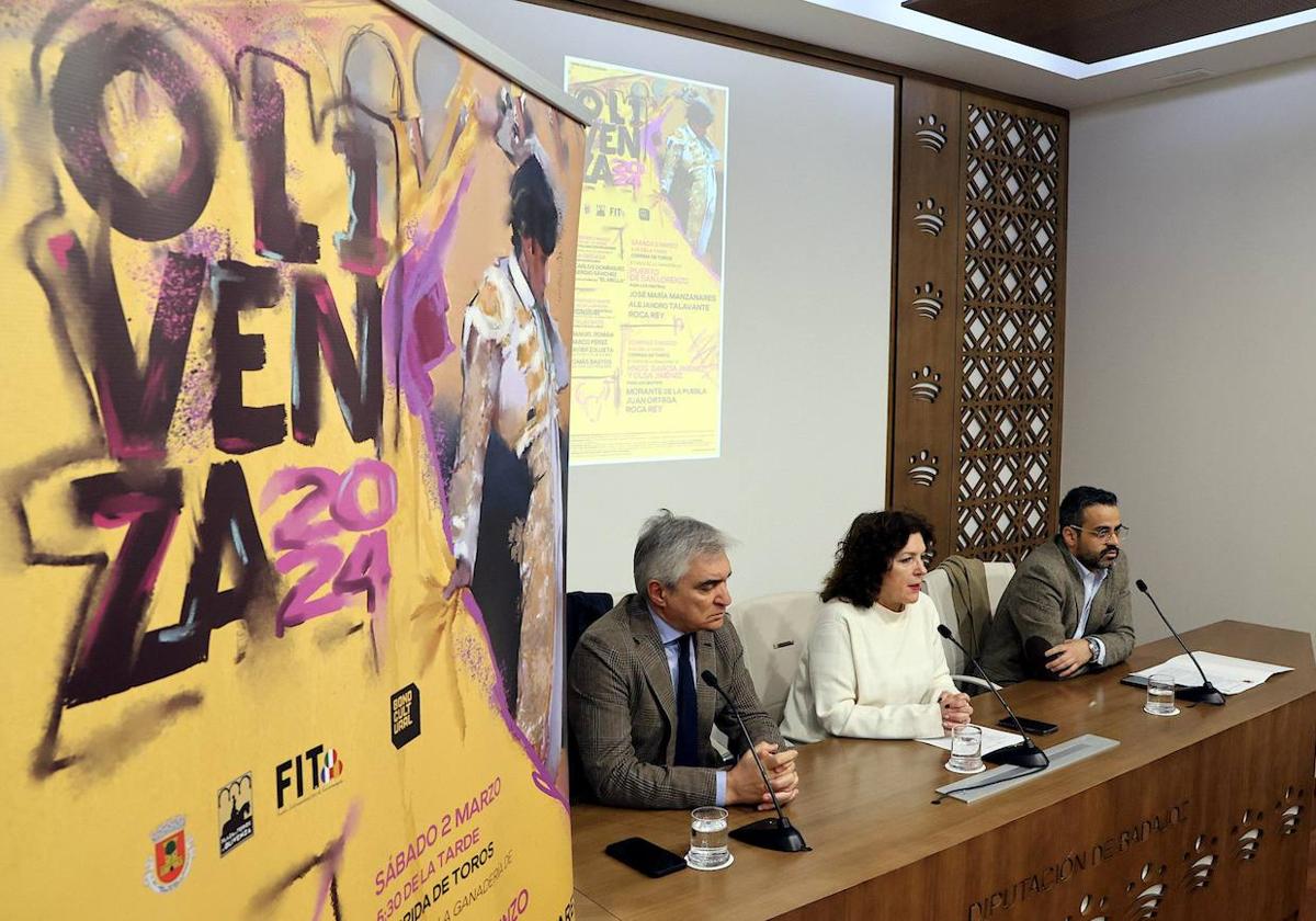 Para presentarla se han dado cita el pasado 19 de febrero en la Diputación de Badajoz, colaboradora del evento, la diputada delegada del Organismo Autónomo Escuela de Tauromaquia, María Concepción López; Manuel J. González Andrade, alcalde de Olivenza; y el representante de la empresa organizadora de los festejos taurinos, José Cutiño.