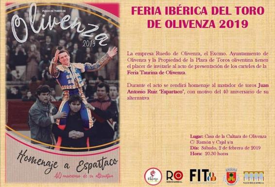 Por este motivo este sábado, 2 de febrero, a las 20.30 horas, la casa de la cultura de Olivenza acogerá el acto de presentación del cartel 2019, evento en que este año se tributará un homenaje al diestro sevillano Juan Antonio Ruiz Román 'Espartaco', para conmemorar el 40º aniversario de su alternativa.