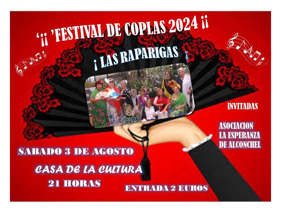 Se trata del 'Festival de la Copla' organizado y protagonizado por la Asociación de Mujeres 'Las Raparigas', quienes estarán acompañadas en esta ocasión por la Asociación 'La Esperanza' de la vecina población de Alconchel.