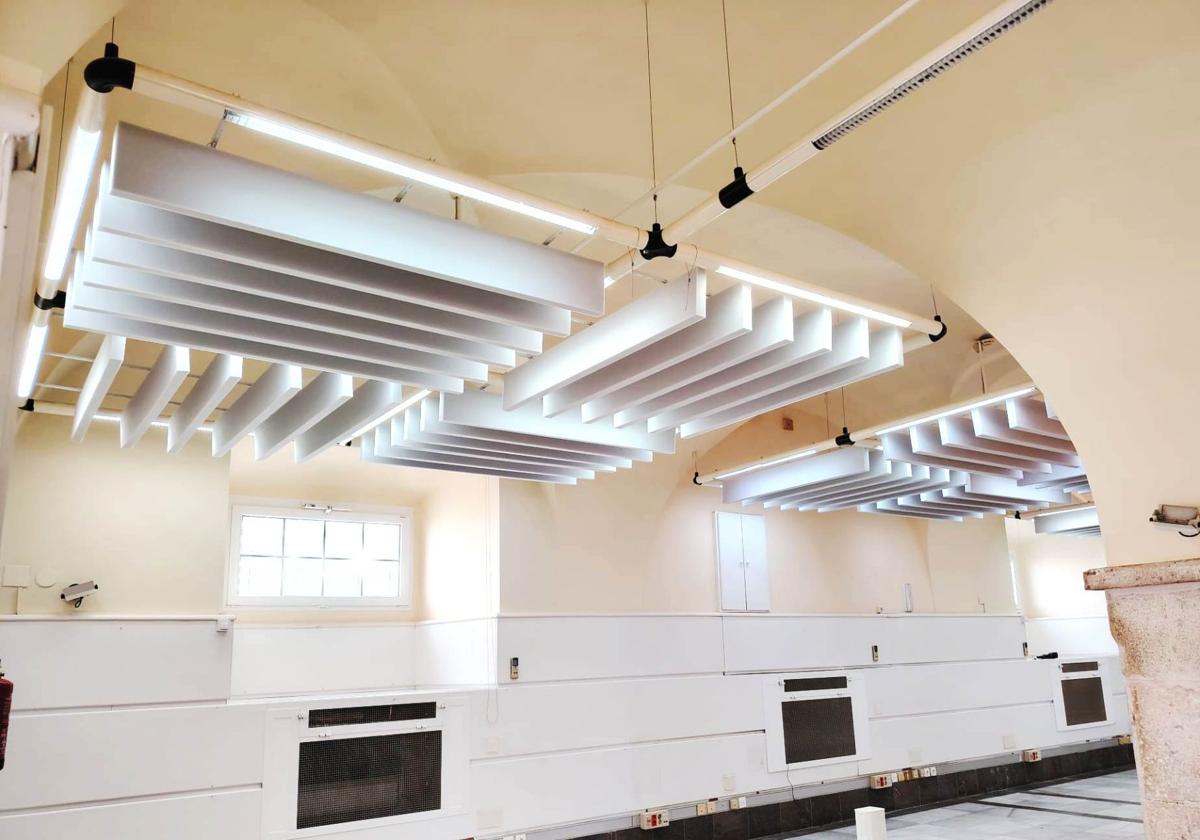 El edificio, que destaca por sus techos abovedados y su valor arquitectónico, presentaba importantes retos acústicos debido a la elevada reverberación del sonido durante los ensayos. Para solucionar este problema, se ha llevado a cabo la instalación de un moderno sistema de paneles fonoabsorbentes suspendidos que reduce el eco y mejora notablemente la calidad sonora del espacio.