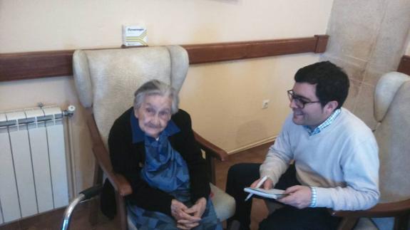 Aunque nació y vivió en Táliga, lleva desde el año 2000 en el Hospital y Santa Casa de Misericordia de Olivenza. Acompañado del director-administrador de la residencia, José Gómez Costa, subimos a la sala de estar de la centenaria institución para visitar a María Garrido, que enseguida se muestra encantada de ser entrevistada.