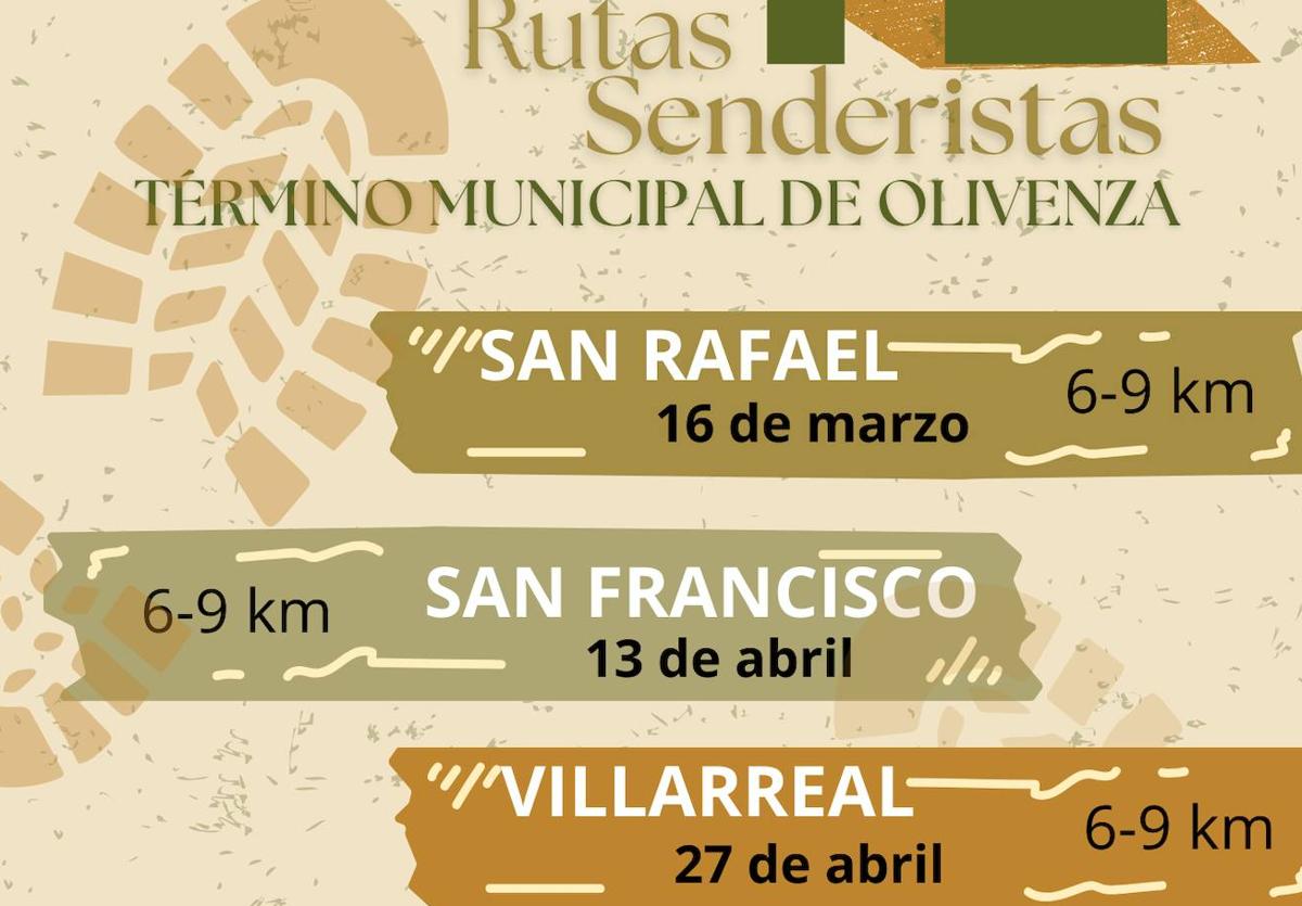 La primera de las rutas saldrá desde San Rafael de Olivenza el próximo sábado 16 de marzo; la segunda desde San Francisco el 13 de abril; el 27 de abril desde Villarreal y el 18 de mayo desde San Benito de la Contienda.