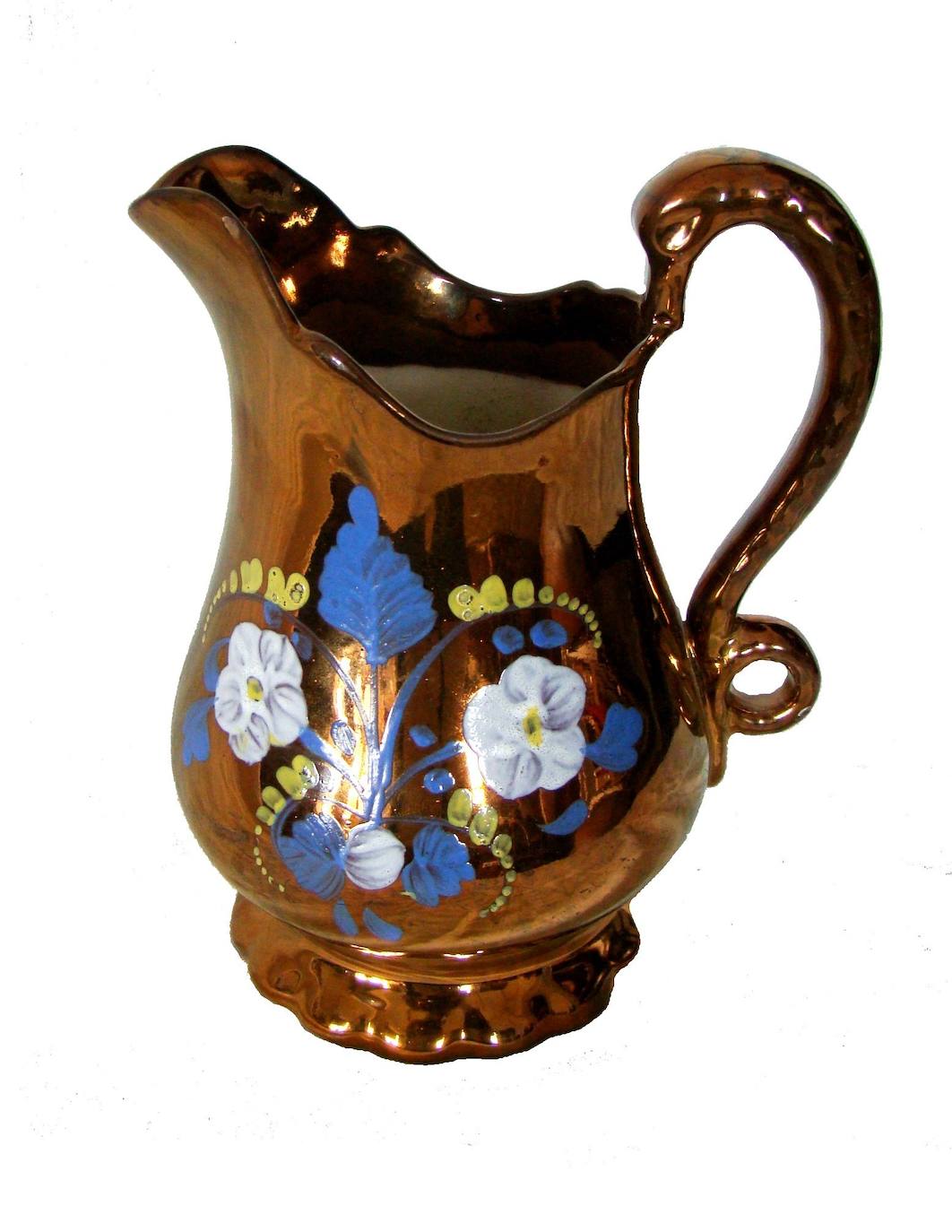 En 1996 la Delegación de la Agencia Tributaria, en Badajoz, entregó al Museo de Olivenza, un total de 12 piezas, 10 jarras, 1 copa y 1 cafetera, que decomisó en la frontera de Caya. De ellas, como muestra, se expone esta jarra, de boca oblonga y pico vertedor elevado; cuerpo globular y cuello ancho. Opuesta al pico vertedor, asa sobreelevada, del borde a la panza, que adopta la forma de cisne. La decoración que presenta su cuerpo, recubierto de vidriado dorado o de reflejos, es pictórica a base de motivos vegetales azules, blancos y amarillos.