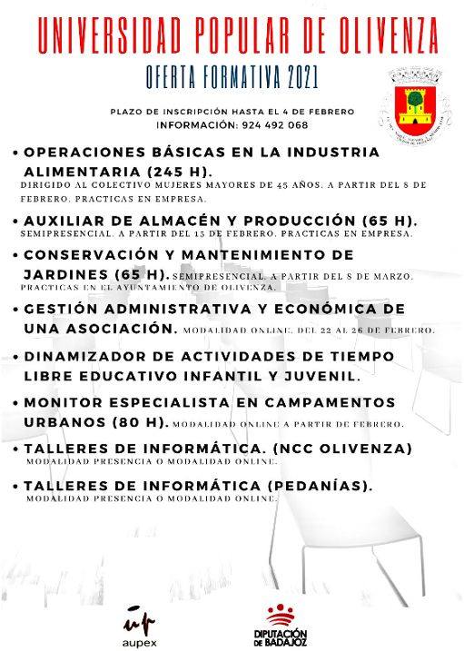 La Universidad Popular de Olivenza (UPO), con la colaboración de la Asociación de Universidades Populares de Extremadura (AUPEX), la Federación Española de Universidades Populares (FEUP), el Servicio Extremeño Público de Empleo (SEXPE) y Diputación de Badajoz, ha diseñado un programa formativo con 8 cursos para el primer semestre de 2021 en Olivenza.