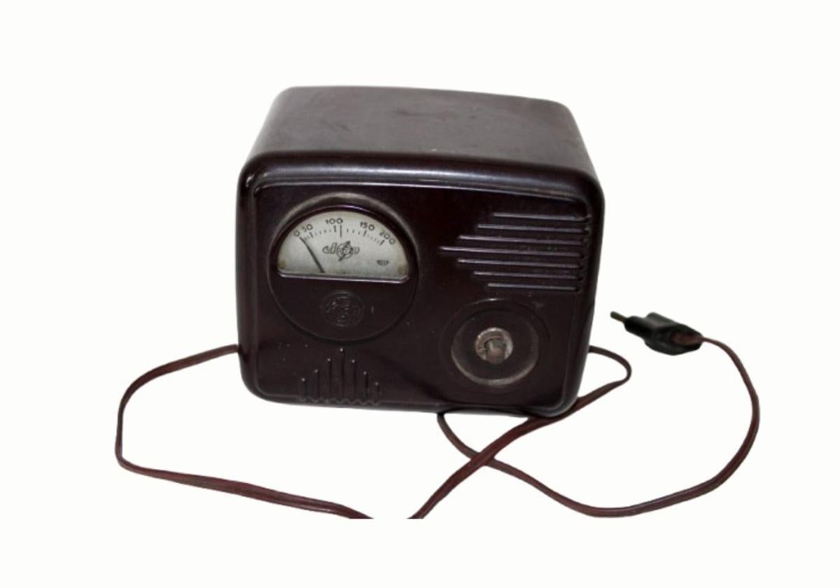 Este problema se solucionó con los elevadores- reductores, como el que se muestra este mes. Su caja es de baquelita marrón y en el frontal se aprecia el voltímetro, graduado de 0 a 200 voltios, que indica el valor de la tensión de salida del receptor, y el conmutador manual (no se conserva), para regularla. Se colocaba entre el enchufe y la radio para asegurar que la intensidad de la corriente no fuera peligrosa para el aparato.