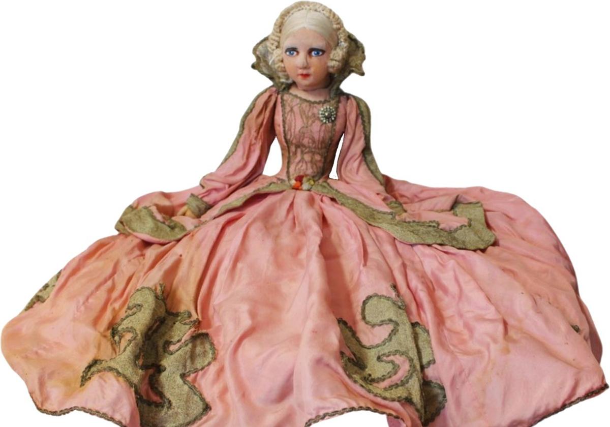 El Museo Etnográfico Extremeño González Santana ha elegido como pieza del mes de enero una muñeca boudoir. Esta pieza que se expone viste traje de época de color rosa, con sobrefalda y aplicaciones de blonda en el delantero y en el cuello. Este se eleva por detrás de la cabeza gracias a un alambre. La falda es larga y amplia y se ahueca con dos enaguas, la interior, más corta, con aro para darle volumen.