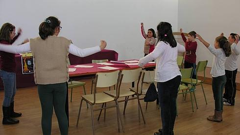 Concluida la interpretación dos componentes de Los Chaparritos, miembros más jóvenes de La Encina, mostraron al resto de participantes del taller los pasos básicos de la danza que mañana por la noche se bailará entorno a una hoguera en el adro de la Iglesia de Santa María Magdalena.