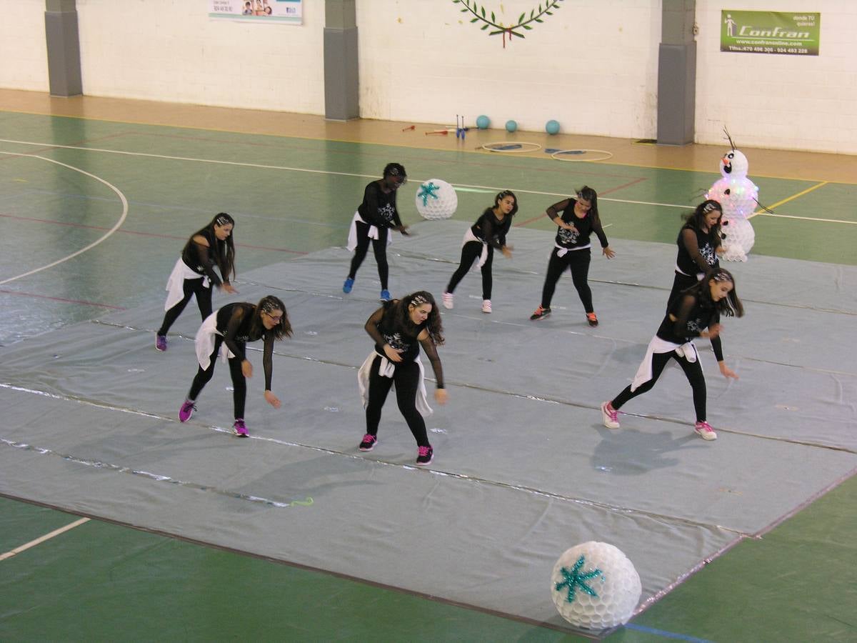 Un muñeco de nieve y algunas bolas gigantes ponían ayer en situación al público que asistió en el Pabellón Deportivo a la exhibición navideña de ... la Escuela Municipal de Gimnasia Rítmica, ambientada en la película infantil Frozen: El reino del hielo.