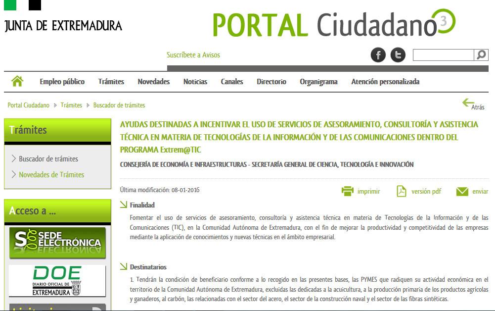 La Secretaría General de Ciencia, Tecnología e Innovación de la Junta de Extremadura ha convocado la ayudas del programa Extrem@TIC para 2016, destinadas a incentivar el uso de servicios de asesoramiento, consultoría y asistencia técnica en innovación empresarial a las pymes extremeñas que decidan mejorar su capacidad productiva y competitiva apoyadas en servicios que empresas externas del sector tecnológico les puedan prestar.