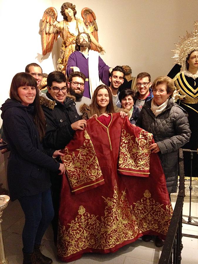 Realizada en brocatel italiano de seda burdeos, la nueva túnica es obra de las manos de la Hermana Antonia Vázquez y fue recogida de manos de los jóvenes cofrades por la Hermana Mayor María del Carmen González.
