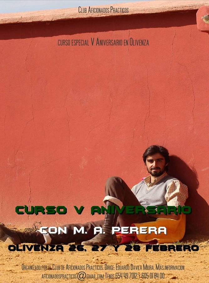 El Club de Aficionados Prácticos que dirige el matador de toros sevillano Eduardo Dávila Miura, celebrará los días 26, 27 y 28 de febrero en Olivenza un curso especial con motivo de su quinto aniversario, en el que participará el torero pacense Miguel Ángel Perera.