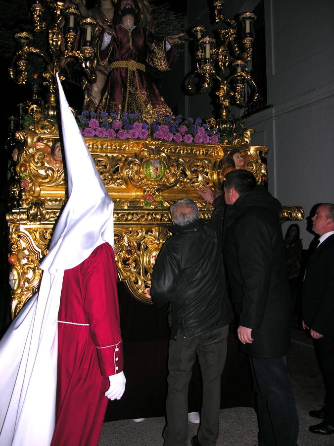 La primera imagen en aparecer por las puertas del templo de Santa María del Castillo fue la Oración en el Huerto, vistiendo para la ocasión la talla de Jesús una túnica donada el pasado mes de febrero por la Juventud Cofrade de Los Coloraos. Realizada en brocatel italiano de seda burdeos, la nueva túnica es obra de la Hermana Antonia Vázquez.