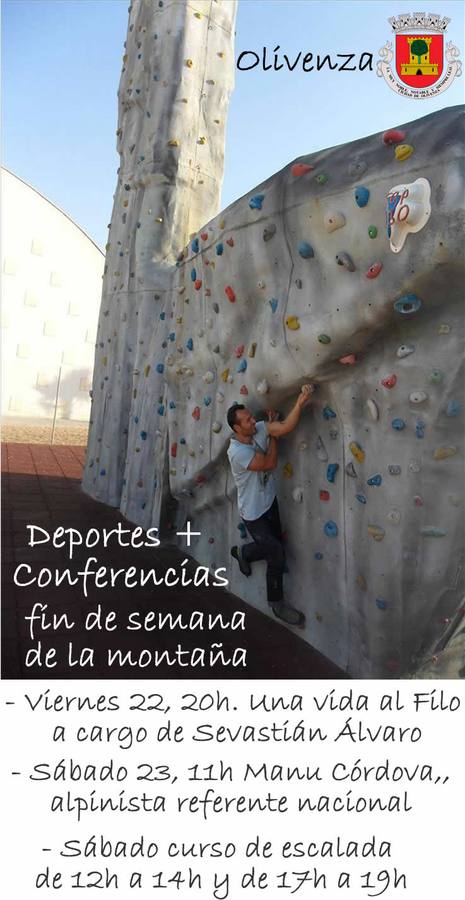 Los días 22 y 23 de abril, la Concejalía de Deportes del Ayuntamiento de Olivenza acercará el mundo de la montaña a todas aquellas personas que quieran conocer de primera mano las experiencias de destacados especialistas como Sebastián Álvaro o Manu Cordova y practicar escalada en el rocódromo municipal.