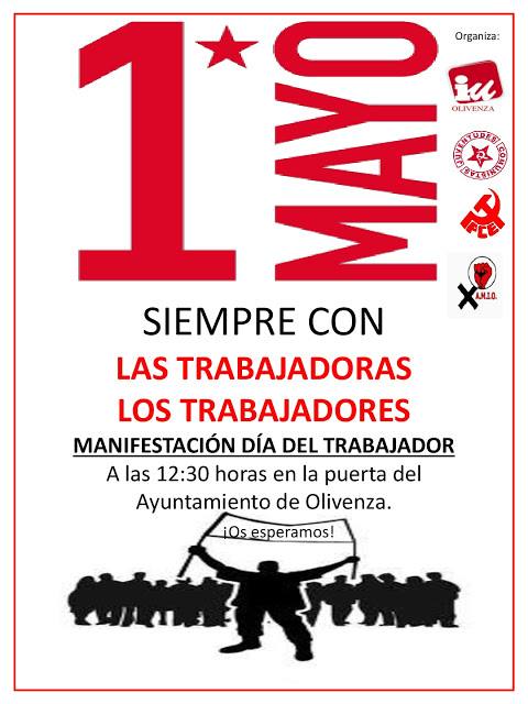 Como cada primero de mayo, Izquierda Unida Olivenza convoca una manifestación con motivo del Día Internacional del Trabajo, que se celebrará el próximo domingo a las 12.30 horas en las puertas del Ayuntamiento.