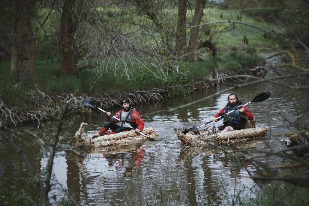 El educador ambiental de Caminos del Guadiana, Alejandro Molina, y el instructor de supervivencia de Aborigen, Maykol García, recorren desde mediados de abril los más de 800 kilómetros del curso del Guadiana en dos embarcaciones de 2,25 metros de eslora elaboradas con enea, la planta más común que crece en las riberas del río.