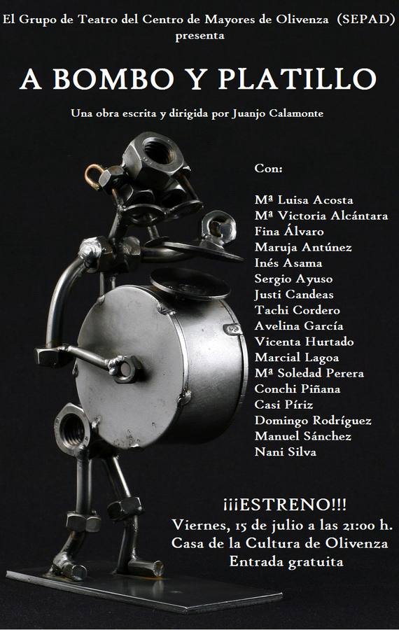 A bombo y platillo es una obra cuyo texto ha sido creado por Calamonte pensando en las personas que lo iban a poner en escena y buscando, pese a su tono de comedia, transmitir un mensaje tan importante como las capacidades, a veces infravaloradas, de los mayores.
