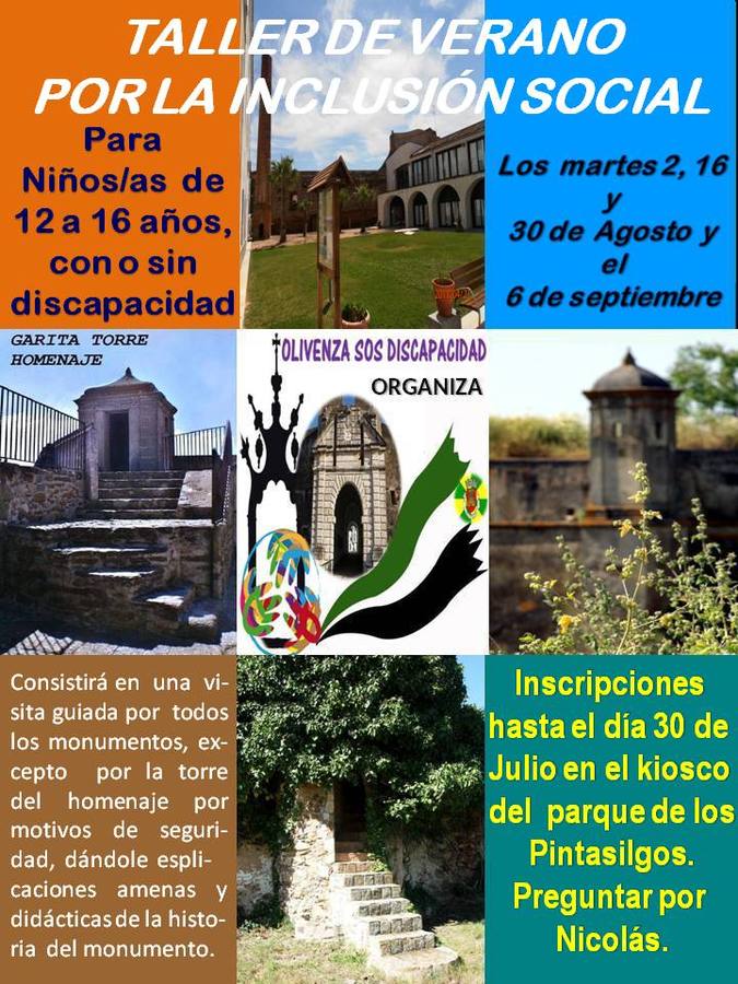 La asociación de personas con diversidad funcional Olivenza SOS Discapacidad llevará a cabo los martes 2, 16 y 30 de agosto y el 6 de septiembre un taller estival por la inclusión social con el patrimonio oliventino como protagonista.