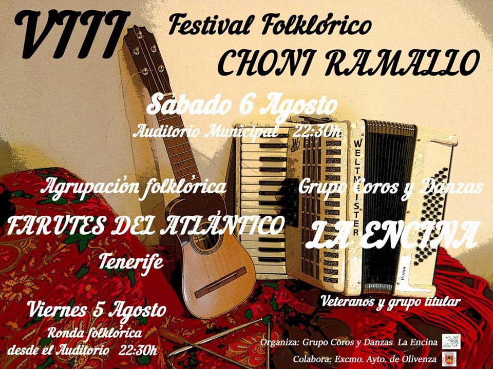 La cita principal del VIII Festival Folklórico Choni Ramallo tendrá lugar el sábado 6 de agosto a las 22.30 horas en el Auditorio Municipal, con las actuaciones de Farutes del Atlántico y del grupo de adultos y veteranos de La Encina, que vendrá precedida de un desfile que comenzará a las 22 horas en la Plaza de Santa María y recorrerá las calles Duque de Cadaval, Plaza de la Constitución, Calle Moreno Nieto, Avenida de Portugal, Plaza de España, Avenida Ramón y Cajal para concluir en el Auditorio Municipal.