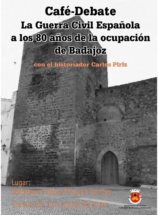 La Biblioteca Municipal Manuel Pacheco acogerá el próximo viernes 12 de agosto, a partir de las 20 horas, un café-debate que contará con la presencia del historiador oliventino Carlos Píriz, quien pondrá sobre la mesa diversas temáticas en torno a la Guerra Civil española en el mes en el que se cumplen 80 años de la ocupación franquista de la ciudad de Badajoz.