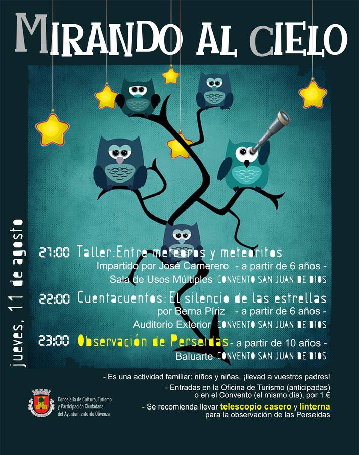 Tras el éxito del pasado año regresa la actividad Mirando al cielo para invitar a disfrutar de nuevo de una didáctica observación astronómica y otras actividades relacionadas, al precio de un euro, a todas aquellas personas que lo deseen en la noche del 11 al 12 de agosto, fecha en la que la lluvia de estrellas conocida como Perseidas o Lágrimas de San Lorenzo alcanza su máximo visible.