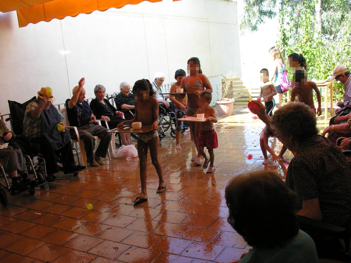 Divididos en grupos de ocho personas, mientras unos niños y niñas jugaban en la terraza del centro residencial junto a los mayores otros lo hacían en el gimnasio con otros residentes. Los grupos fueron rotando para que todos pudieran participar de un juego que en la terraza consistía en que los mayores lanzaran globos de agua a los pies de los menores que caminaban con una taza llena de una cantidad de agua que no podían derramar.