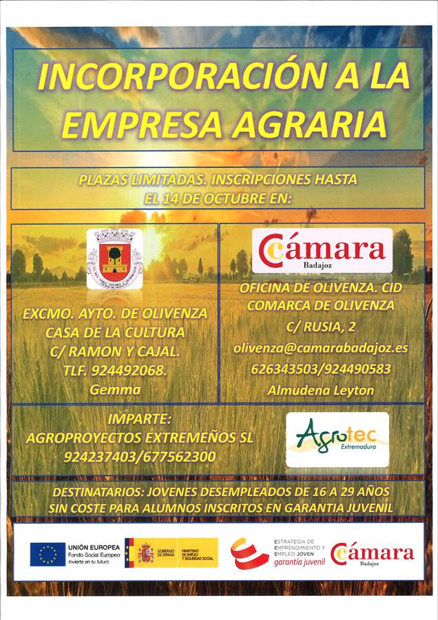 La Cámara de Comercio de Badajoz, a través de la Antena Local de Olivenza, y el Consistorio oliventino ofertan el curso Incorporación a la empresa agraria, destinado a jóvenes sin empleo de 16 a 29 años y que será impartido por Agrotec en la localidad.