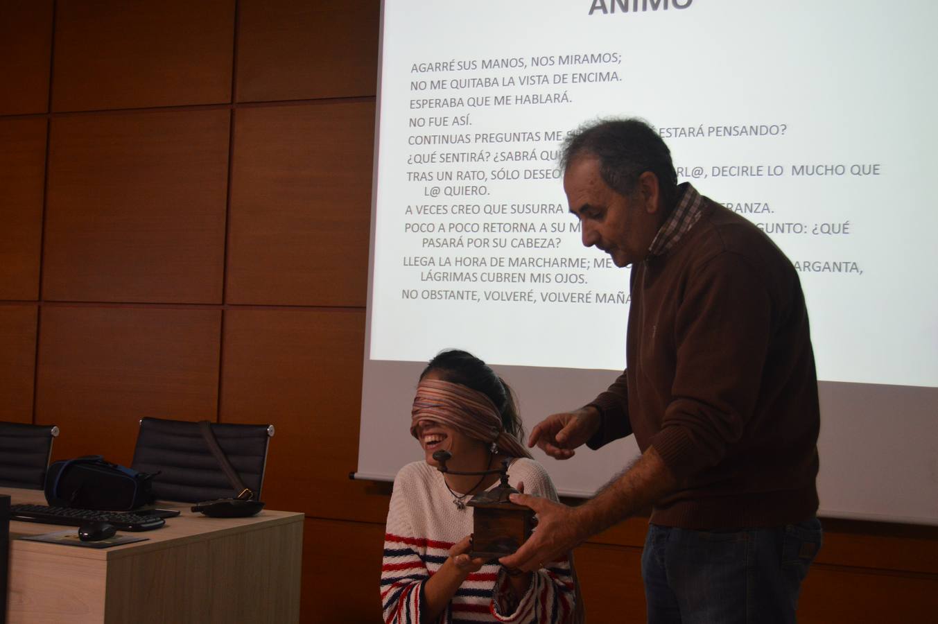 La metodología de trabajo se mostró con proyecciones audiovisuales y solicitando a una alumna que manipulara y oliera un molinillo, entre otros objetos, con los ojos tapados para restarle capacidades situándola en las mismas condiciones que algunos mayores, explica la terapeuta de Caser Residencial Olivenza, y pidiendo que explicara que le evocaba.