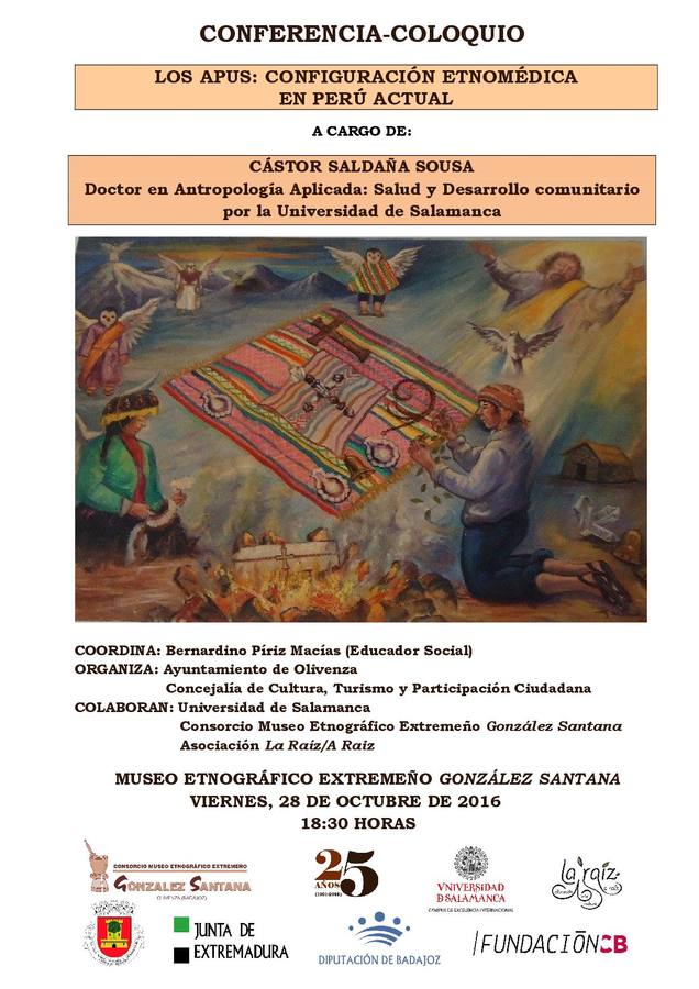Cástor Saldaña Sousa, oliventino licenciado en Psicología y doctor en Antropología de la Salud y Desarrollo Comunitario por la Universidad de Salamanca, abordará mañana viernes ... 28 de octubre en el Museo Etnográfico Extremeño, a partir de las 18.30 horas, la configuración etnomédica en el Perú actual, un estudio de la medicina tradicional.