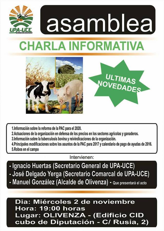 La Unión de Pequeños Agricultores y Ganaderos de Extremadura, UPA-UCE Extremadura, realizará el próximo miércoles, 2 de noviembre, una charla informativa en el Centro Integral de Desarrollo de la Comarca de Olivenza sobre las últimas novedades en relación con la PAC (Política Agrícola Común), los robos en el campo y algunas reivindicaciones, entre otros temas.