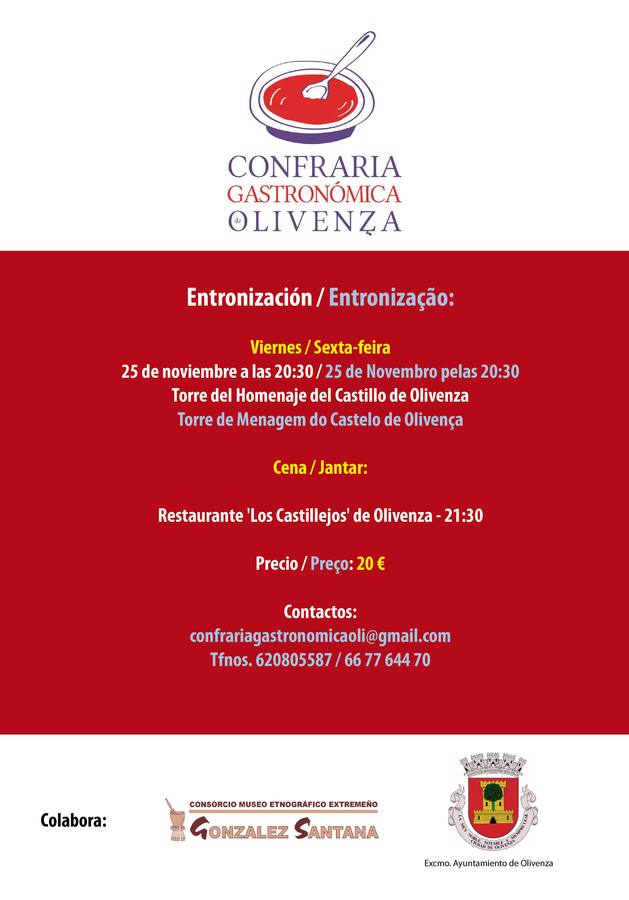 El acto, cuyo acceso es libre, comenzará a las 20.30 horas e irá seguido de una cena en el restaurante Los Castillejos, a las 21.30 horas, en la que podrá tomar parte todas aquellas personas que así lo indiquen hasta mañana martes, 22 de noviembre, contactando a través de los teléfonos 620 805 587 y 667 764 470 o en confrariagastronomicaoli@gmail.com