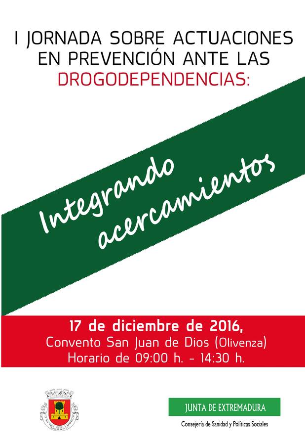 En cumplimiento de este acuerdo el próximo 17 de diciembre se celebrarán en Olivenza las I Jornadas sobre actuaciones en prevención ante las drogodependencias: integrando acercamientos que contarán con la participación de representantes de los ámbitos sanitario, psicológico, político, educativo y social, así como de las familias.