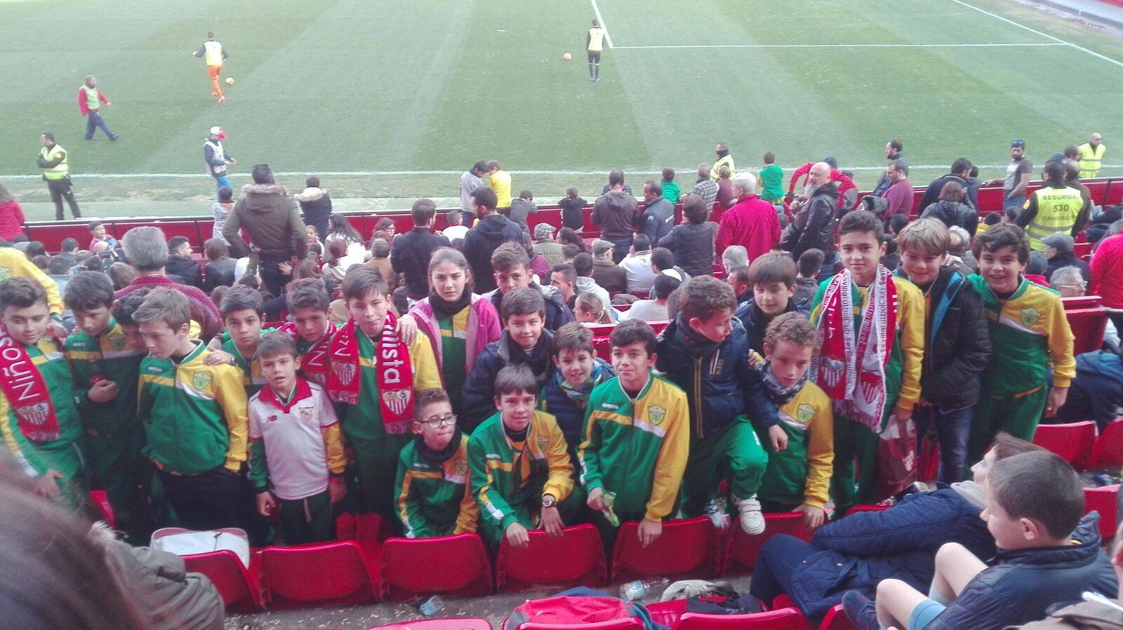 Tras la comida, todo el grupo se dirigió al mítico estadio de fútbol Ramón Sánchez Pizjuan donde, disfrutaron de una de sus pasiones asistiendo al encuentro entre el Sevilla Atlético y el CD Tenerife, perteneciente a la Jornada 23 de la Liga 1|2|3, y salpicaron las gradas con los colores de Olivenza que muestran los chándal de la equipación de A Vila E.D.