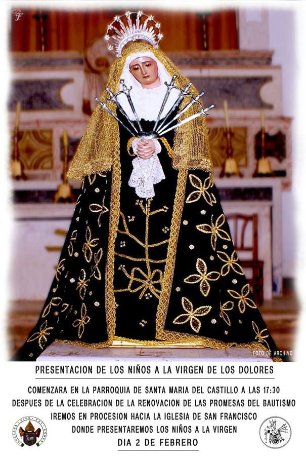 Posteriormente, menores, familias y todas las personas que quieran asistir al acto se dirigirán en procesión hacia la iglesia de San Francisco, donde por primera vez se llevará a cabo la presentación ante la Virgen de los Dolores para que les proteja y bendiga a lo largo de toda su vida, como se indica desde la Cofradía de Los Obreros, coorganizadora del acto.