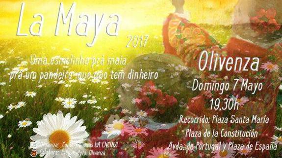 La Maya en Olivenza es una niña o joven vestida de blanco y con una corona de flores u otros adornos que suele sentarse en el suelo mientras otros niños y niñas danzan a su alrededor y piden limosnas por las calles. En otro tiempo había distintos grupos de jóvenes que lo celebraban por distintos puntos de la ciudad, pero en la actualidad es el cuerpo de baile infantil de La Encina, más conocido como Los Chaparritos, el que se concentra en la plaza de Santa María del Castillo para bailar la conocida y alegre danza de La Maya. Ataviados de blanco y junto al grupo juvenil de baile vestido de gala, danzarán al son de los acordes de la rondalla de La Encina.