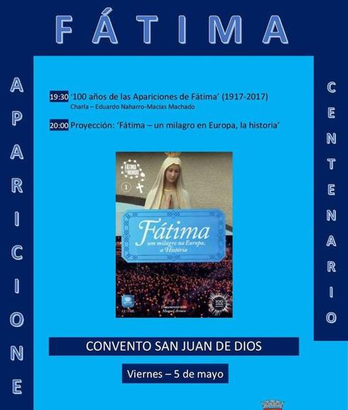 Este viernes, a partir de las 19:30 horas, el Aula de Lengua y Cultura Portuguesa y la Universidad Popular ha organizado en el convento San Juan de Dios una charla de Eduardo Naharro-Macías Machado y la proyección de un documental sobre la aparición mariana.